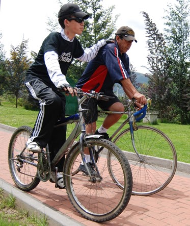 Gino, que tiene baja visión, se sujeta del hombro de su padre para saber por dónde transitar con su bicicleta; con sus gafas obscuras, sus guantes desgastados y un ritmo pausado al pedalear, se detiene en una esquina y repasa un par de recomendaciones con su progenitor antes de conducir por una nueva ruta.El adolescente hizo una modificación en su bicicleta y utiliza solo su mano derecha en el freno posterior, lo que permite que su mano izquierda sujete el hombro de Segundo. Utiliza Este método cuando desconoce algún camino.