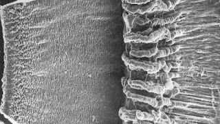 Esta imagen en grises es real, obtenida con el microscopio electrónico de barrido. La parte izquierda es el iris visto por dentro, y se termina en una línea de “montañitas” irregulares y abruptas, que son los procesos ciliares. Insisto de nuevo que para obtener estas imágenes hay que quitar el cristalino y los tendones que van de éste a los procesos ciliares.