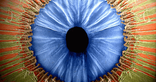En esta imagen vemos el iris desde el interior del ojo. El iris como tal está representado en azul, y está rodeado por una especie de “verrugitas” marrones. Se ha quitado el cristalino y la zónula (las cuerdecitas) para verlo.