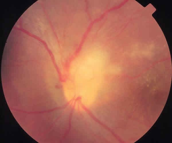 Se trata de un edema de papila unilateral que se manifiesta como una masa blanquecina inflamatoria adyacente al nervio óptico .