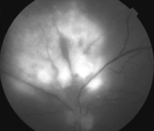 Imagen: Retinitis extensa en un paciente tratado solamente con corticoides por dos meses