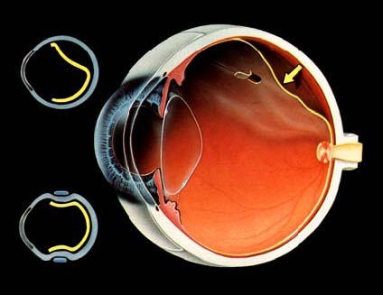 Imagen: representación de un agujero en la retina que deja pasar líquido presente normalmente del centro del ojo por debajo de la retina, el cual la desprende de la pared ocular